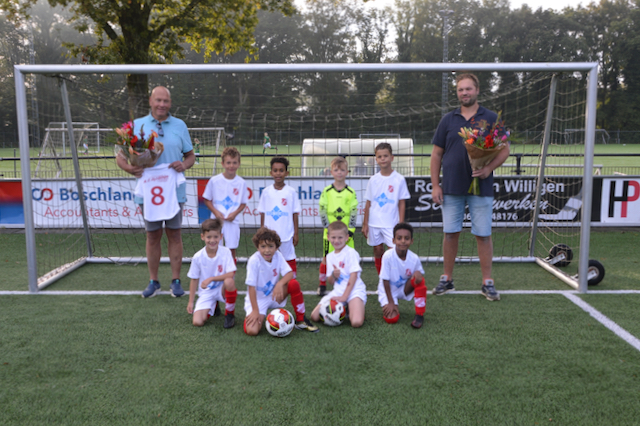 Daar staan ze dan. Candia’66 JO8-1. Voor het eerst op een kwart veld en na de mini Champions league nu mee doen bij de door de knvb georganiseerde competities. Voor de start een mooi moment. Zij ontvingen van de sponsoren MC Afdichtingen en Vleeming kitwerken een mooi tenue.